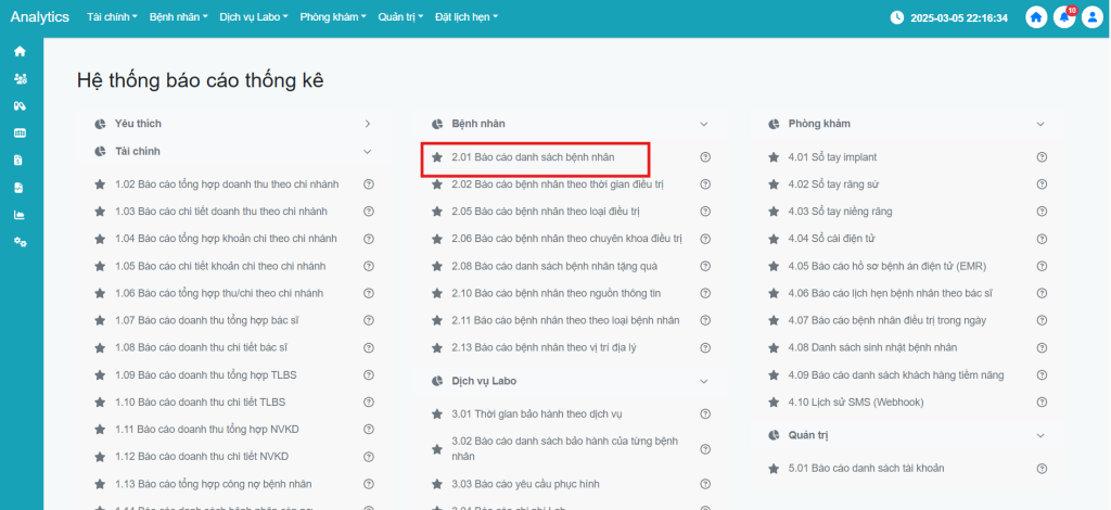 Bước 3: Tìm đến mục 2.01 Báo cáo danh sách bệnh nhân