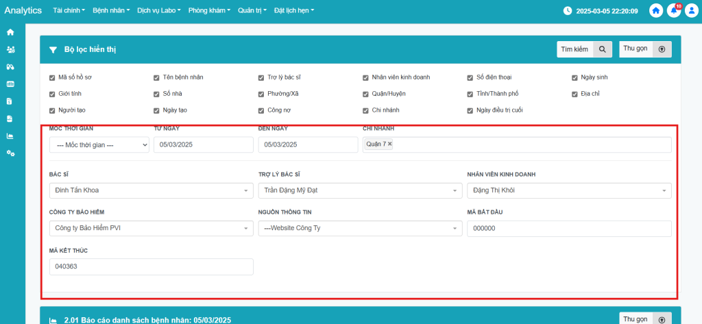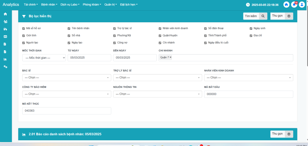 - Nhấn chọn Mã số hồ sơ, Tên bệnh nhân, Ngày sinh, Nhân viên kinh doanh, Giới tính, Số nhà, Người tạo và Chi nhánh bỏ chọn Trợ lý bác sĩ, Số điện thoại, Phường/Xã, Quận/Huyện, Tỉnh/Thành phố, Ngày tạo, Công nợ, Ngày điều trị cuối
