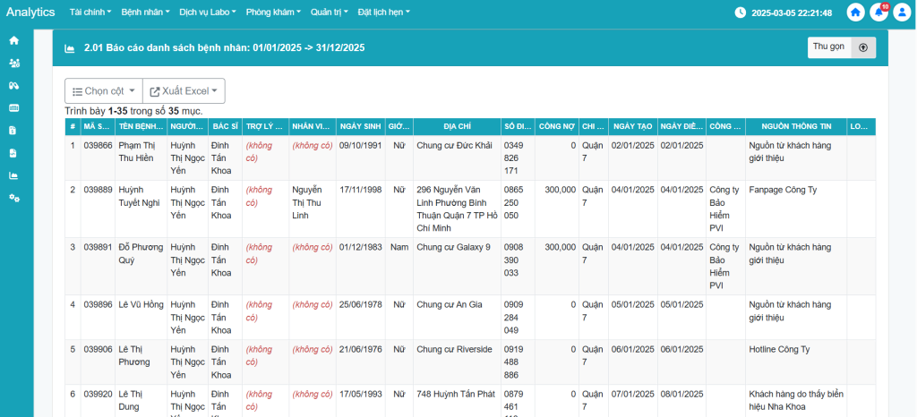 [Báo cáo] Hướng dẫn sử dụng tính năng Báo cáo danh sách bệnh nhân