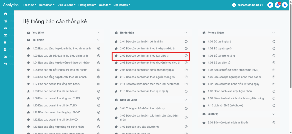 Bước 3: Tìm đến mục 2.05 Báo cáo bệnh nhân theo loại điều trị