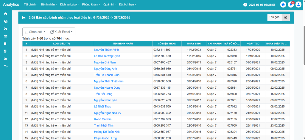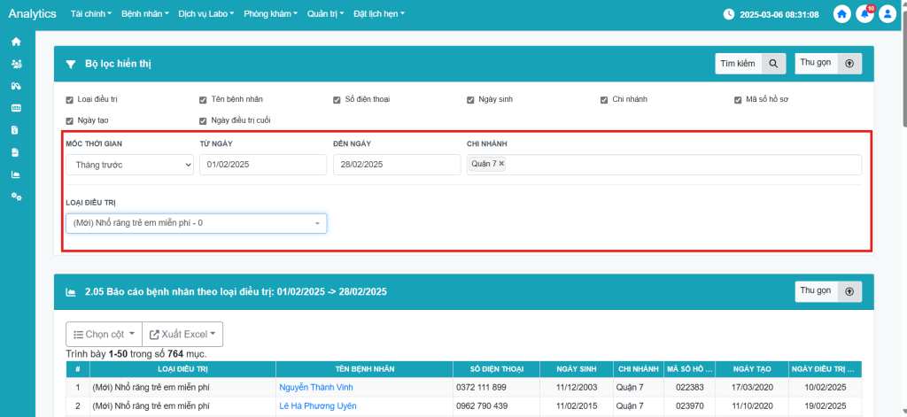 - Nếu bạn muốn hiển thị Loại điều trị, Tên bệnh nhân, Số điện thoại, Ngày sinh và Chi nhánh bạn có thể thực hiện theo các bước dưới đây