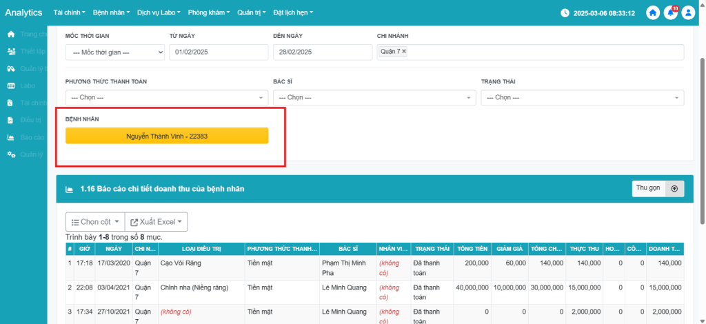 Bước 6: Bạn có thể nhấn vào Tên bệnh nhân để đi đến trang 1.16 Báo cáo chi tiết doanh thu của bệnh nhân
