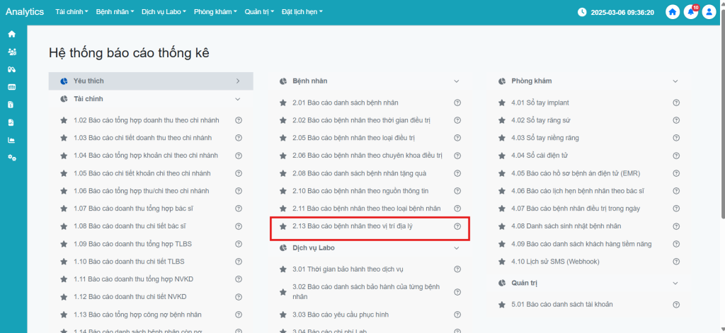 Bước 3: Tìm đến mục 2.13 Báo cáo bệnh nhân theo vị trí địa lý