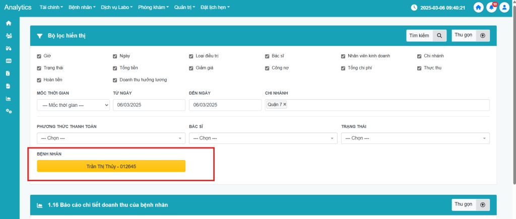 Bước 6: Bạn có thể nhấn vào Tên bệnh nhân để đi đến trang 1.16 Báo cáo chi tiết doanh thu của bệnh nhân