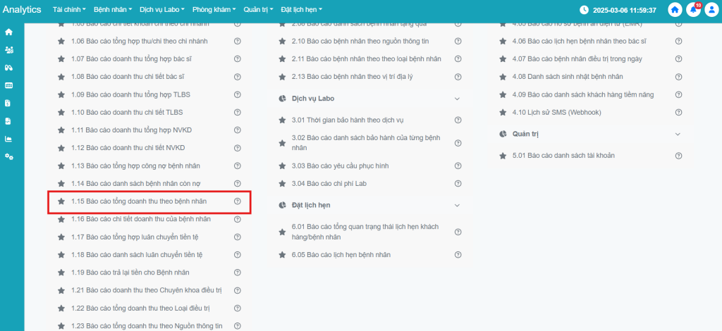Bước 3: Tìm đến mục 1.15 Báo cáo tổng doanh thu theo bệnh nhân