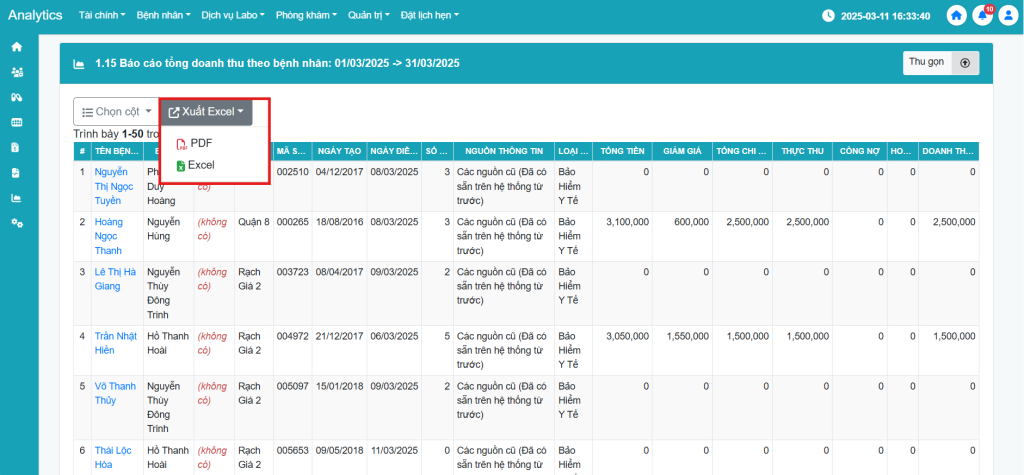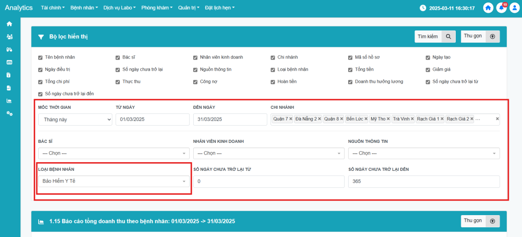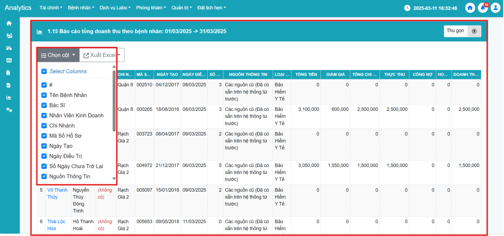 - Nếu bạn muốn hiển thị Tên bệnh nhân, Bác sĩ, Nhân viên kinh doanh, Chi nhánh, Ngày tạo, Tổng tiền, Thực thu, Công nợ, Hoàn tiền bạn có thể thực hiện theo các bước dưới đây