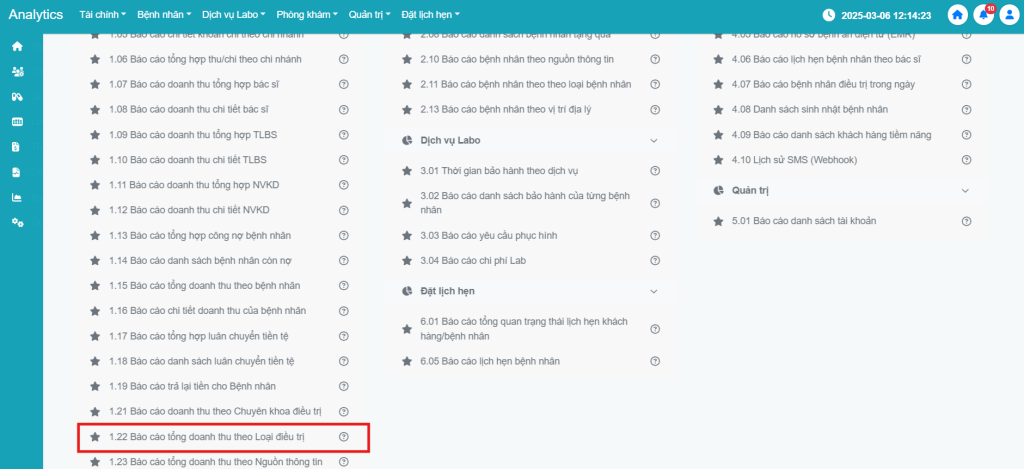 Bước 3: Tìm đến mục 1.22 Báo cáo tổng doanh thu theo Loại điều trị