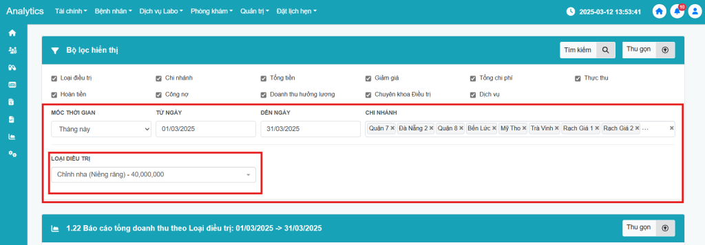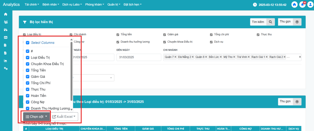 - Nhấn chọn Loại điều trị, Chi nhánh, Tổng tiền, Giảm giá, Tổng chi phí và Thực thu bỏ chọn Hoàn tiền, Công nợ, Doanh thu hưởng lương, Chuyên khoa điều trị, Dịch vụ