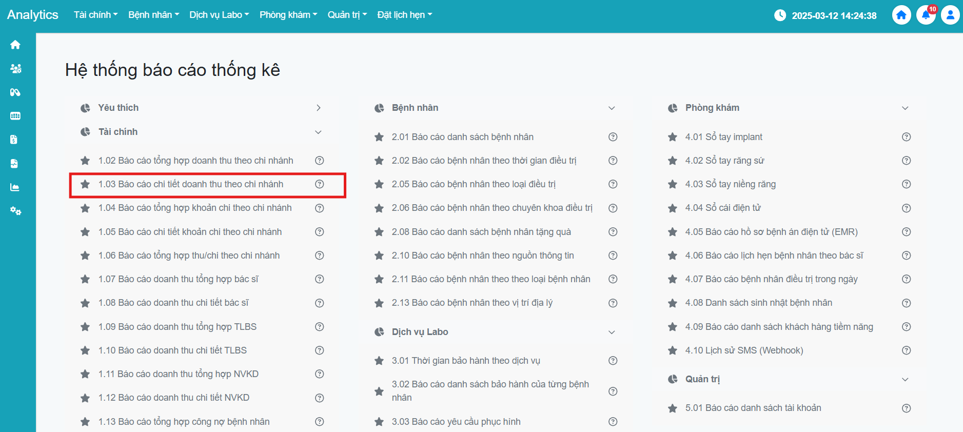 Bước 3: Tìm đến mục 1.03 Báo cáo chi tiết doanh thu theo chi nhánh