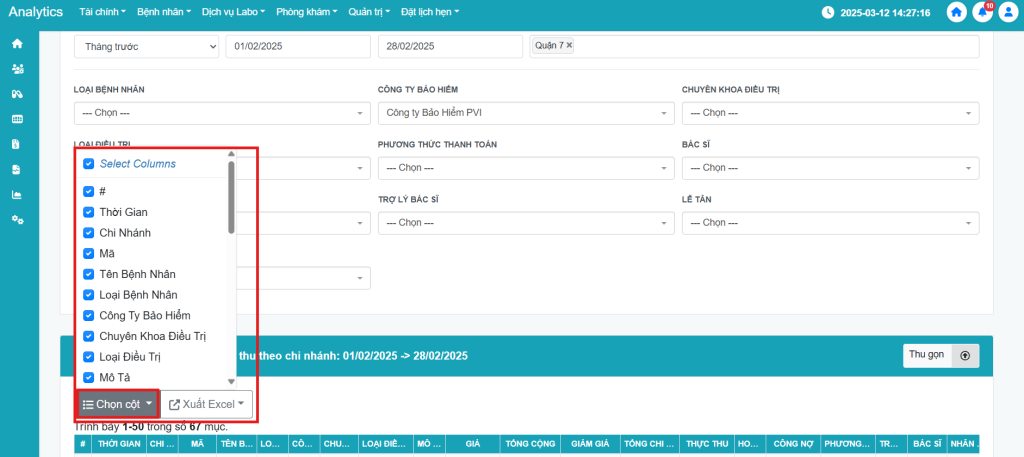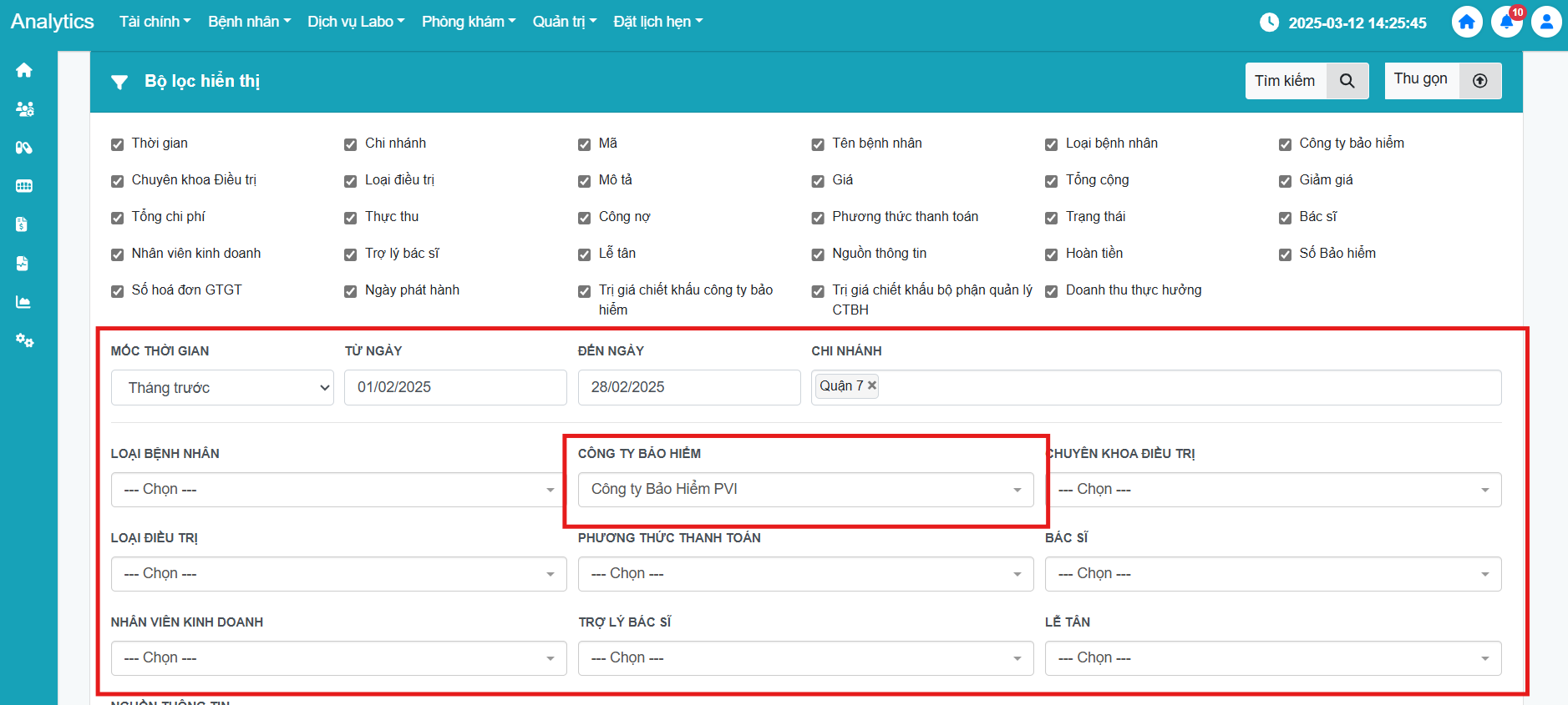 - Nhấn chọn Mốc thời gian, Từ ngày, Đến ngày, Chi nhánh và Công ty bảo hiểm bỏ chọn Mã số hồ sơ, Ngày tạo, Ngày điều trị cuối, Loại bệnh nhân