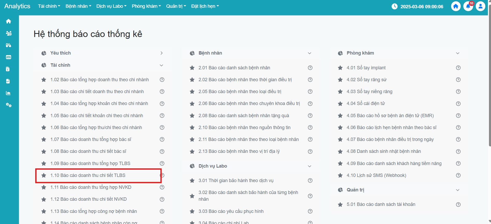 Bước 3: Tìm đến mục 1.10 Báo cáo doanh thu chi tiết TLBS
