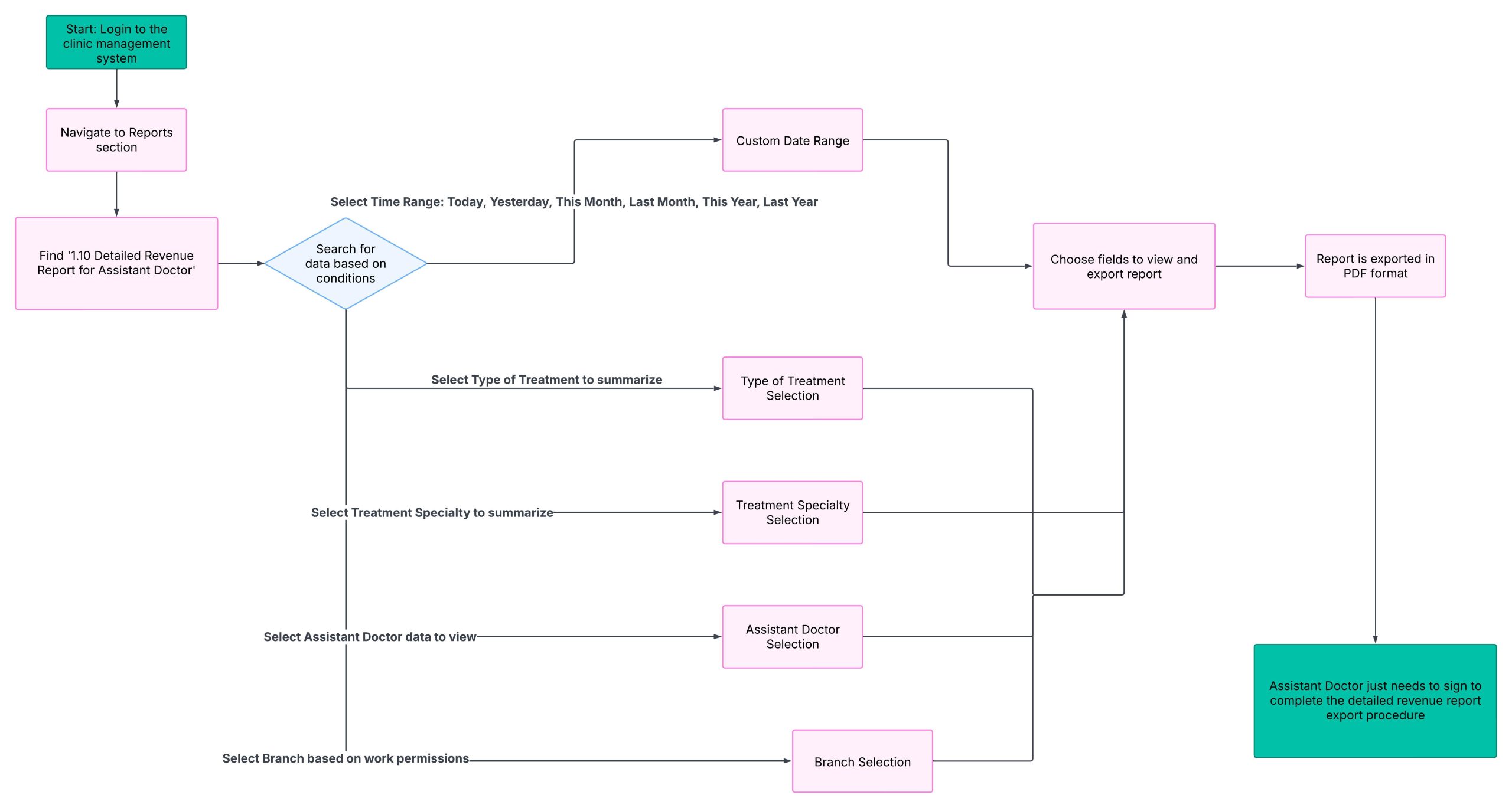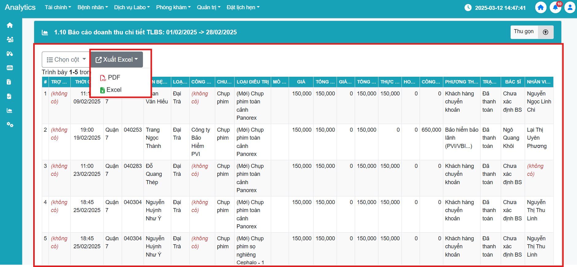 - Báo cáo chi tiết doanh thu của bộ phận Trợ lý bác sĩ phải được xuất ra bằng file PDF từ phần mềm