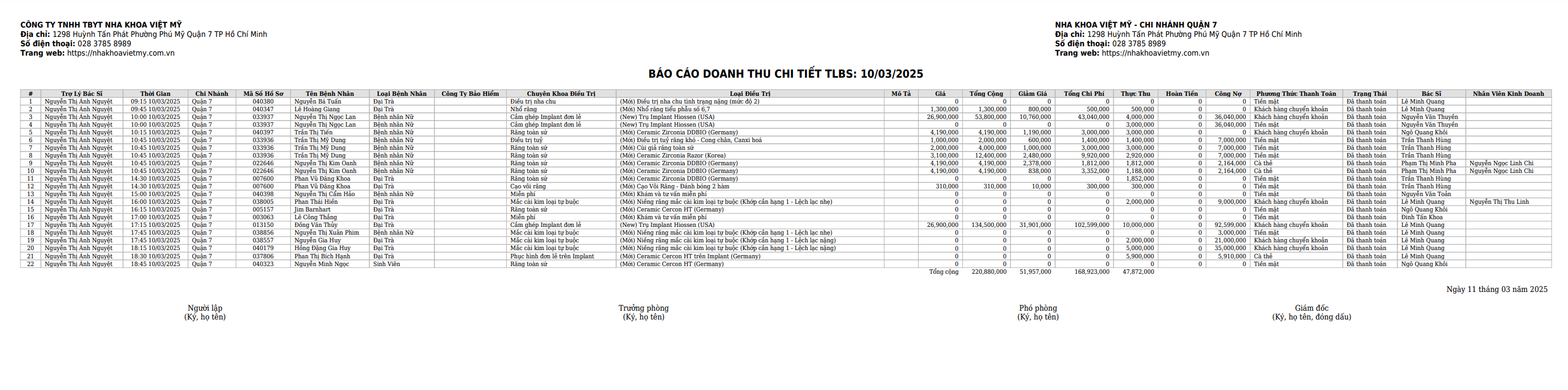 Bước 6: Báo cáo được xuất ra với định dạng PDF với mẫu chuẩn, Trợ lý bác sĩ chỉ cần trình kí là hoàn thành quy trình xuất báo cáo chi tiết doanh thu