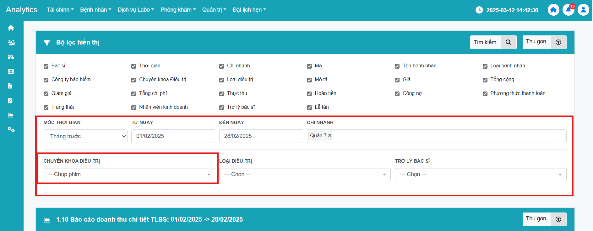 - Nhấn chọn Bác sĩ, Thời gian, Chuyên khoa điều trị, Loại điều trị và Chi nhánh.
