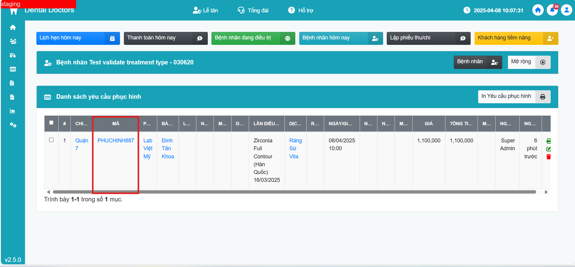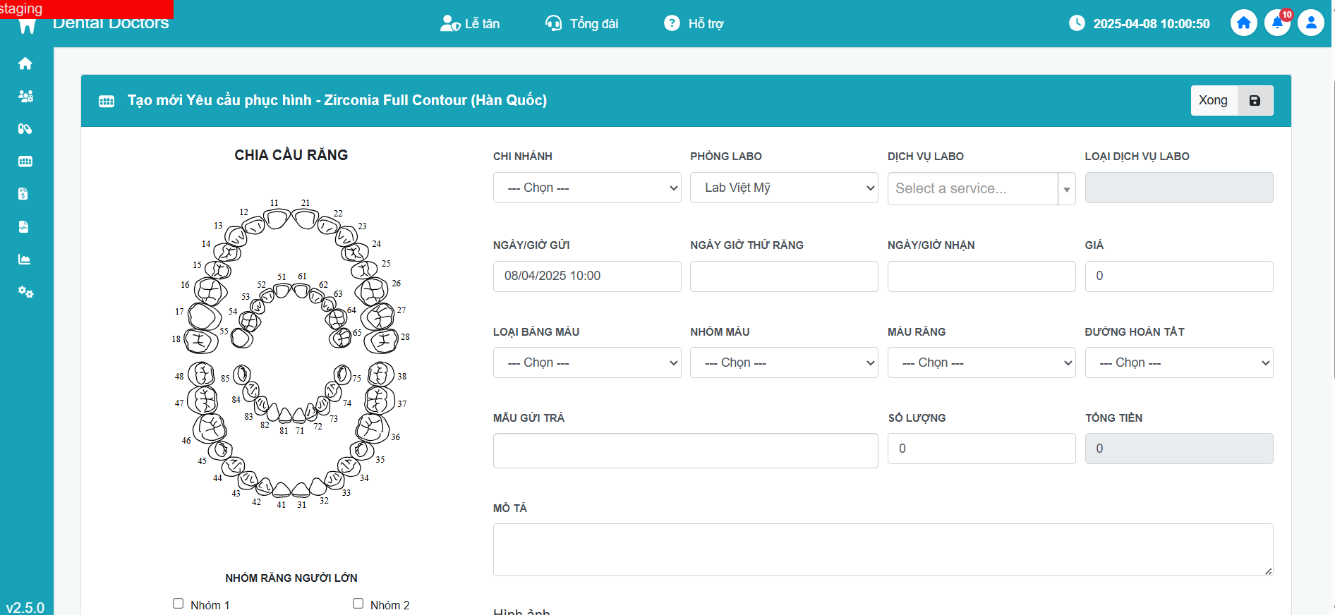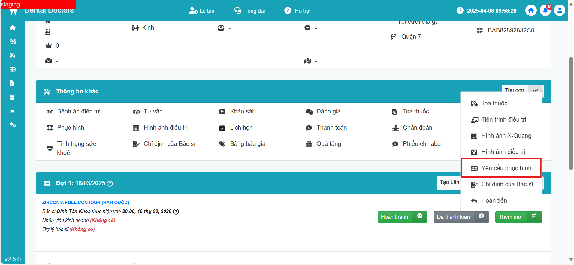 Bước 4: Bấm vào thêm mới và chọn yêu cầu phục hình