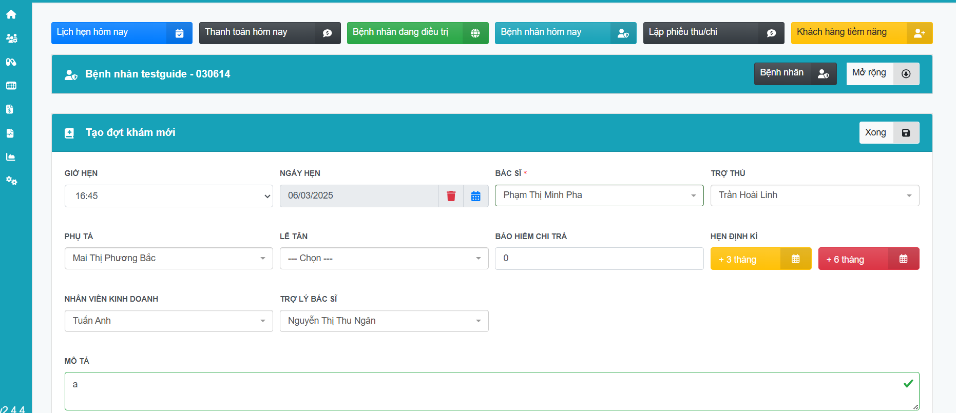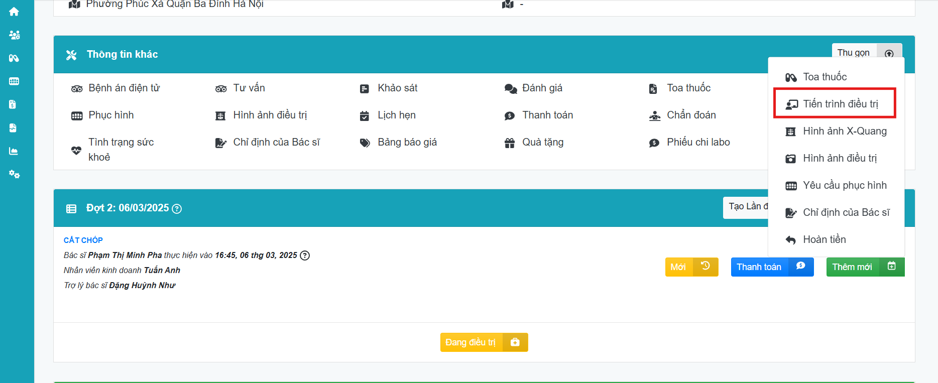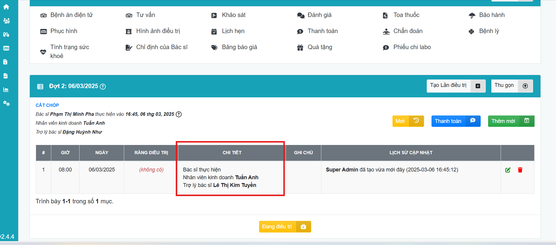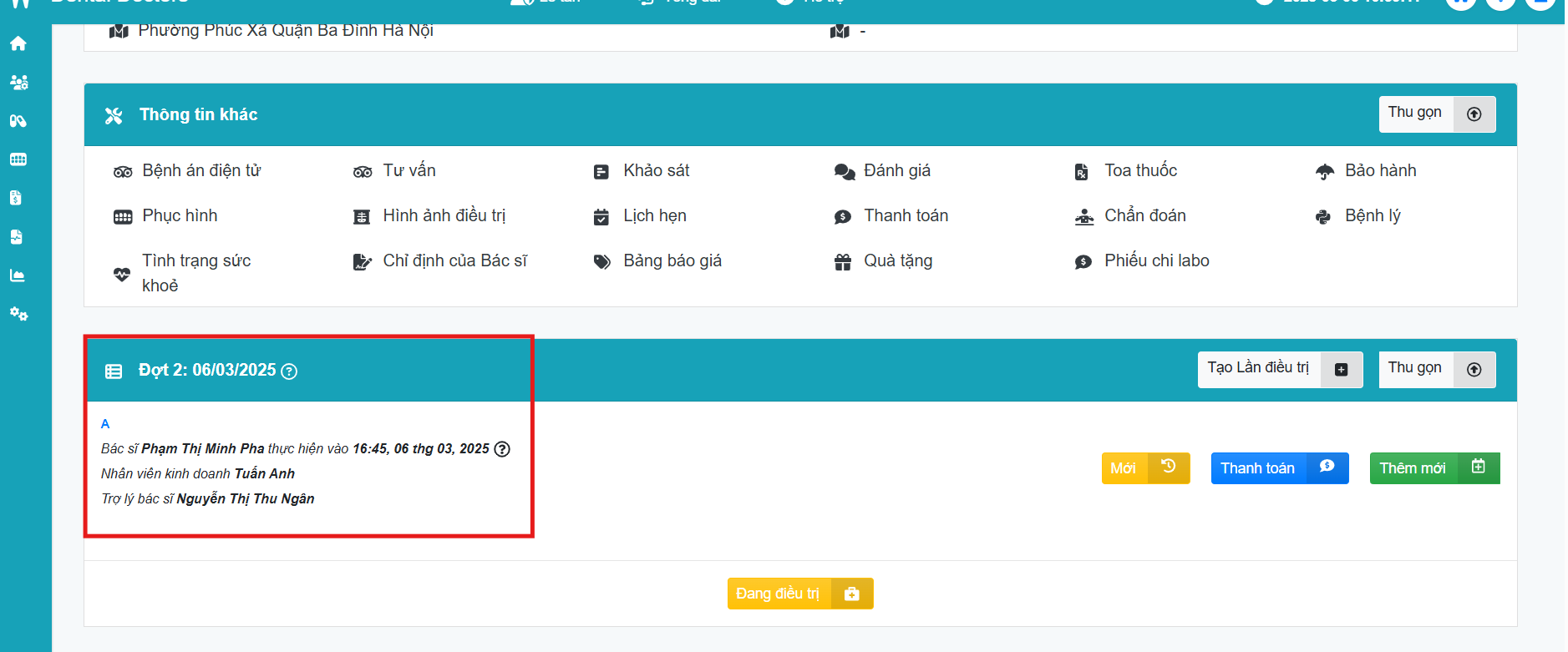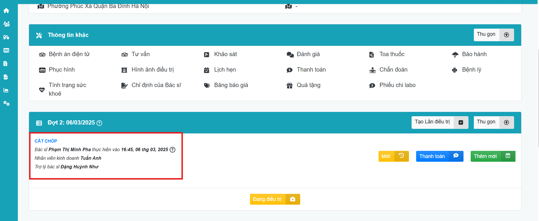 Lưu ý: Bước thêm trợ lý bác sĩ vào đợt điều trị được thực hiện song song với bước nhập hồ sơ điều trị bệnh nhân, nên các trường thông tin khác sẽ cập nhật cùng. Trong phạm vi bài hướng dẫn này sẽ không liệt kê chi tiết các mục trong hồ sơ điều trị