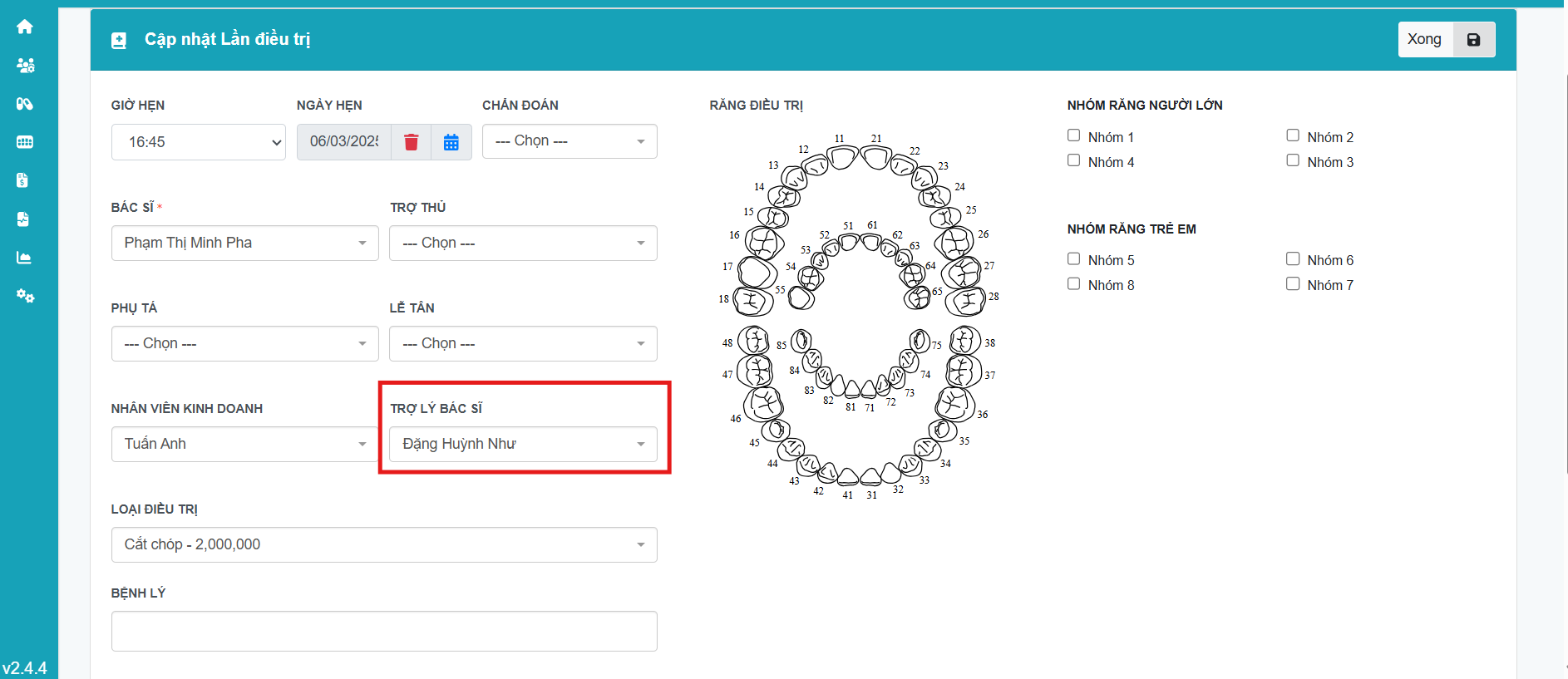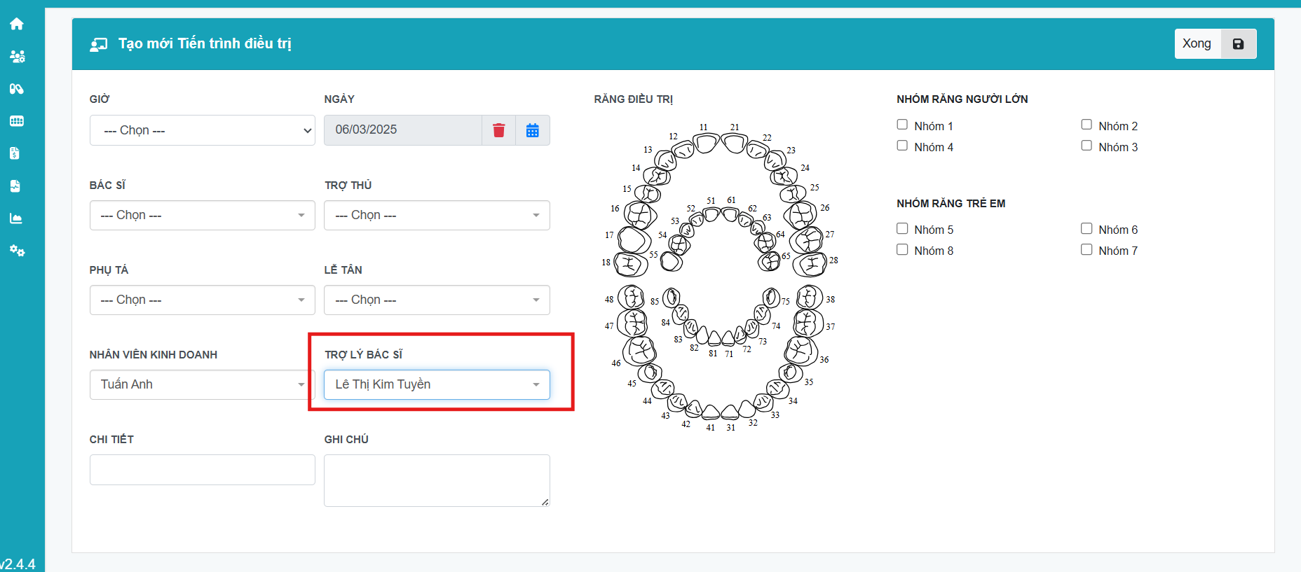 Lễ tân tiến hành nhập thông tin của lần điều trị này (Xem chi tiết ở Hướng dẫn tạo lần điều trị) Trong phạm vi hướng dẫn này người dùng chú ý vào trường chọn Trợ lý bác sĩ