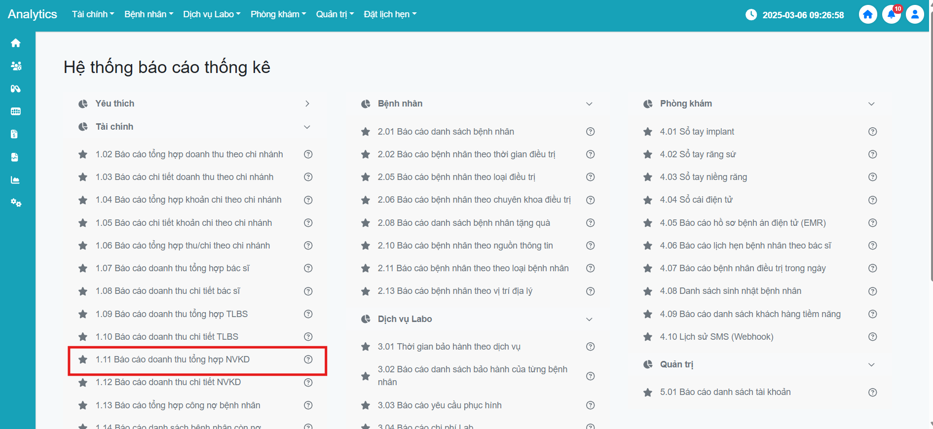 Bước 3: Tìm đến mục 1.11 Báo cáo doanh thu tổng hợp NVKD