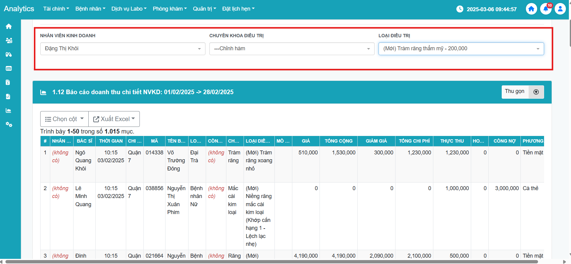 Báo cáo chi tiết doanh thu trợ lý bác sĩ giúp cho người dùng có thể xem được chi tiết những khoản thu điều trị của trợ lý bác sĩ trong mốc thời gian được lựa chọn.