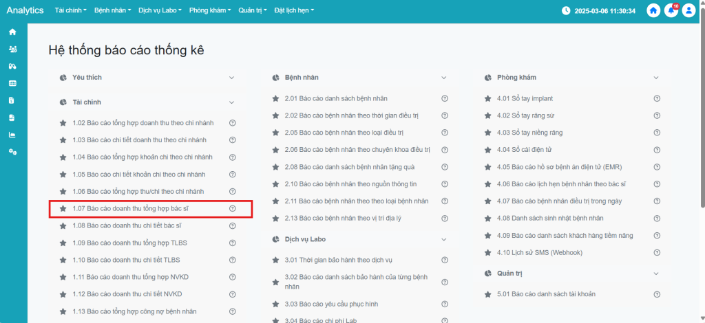 Bước 3: Tìm đến mục 1.07 Báo cáo doanh thu tổng hợp bác sĩ