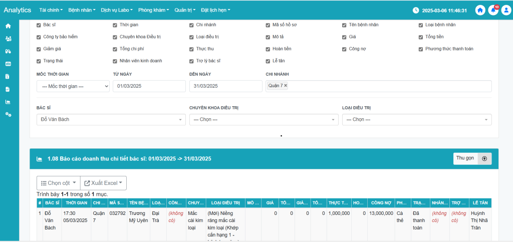 Bước 6: Bạn có thể nhấn vào tên Bác sĩ để đi đến trang 1.08 Báo cáo doanh thu chi tiết bác sĩ