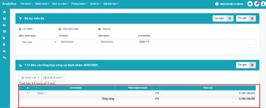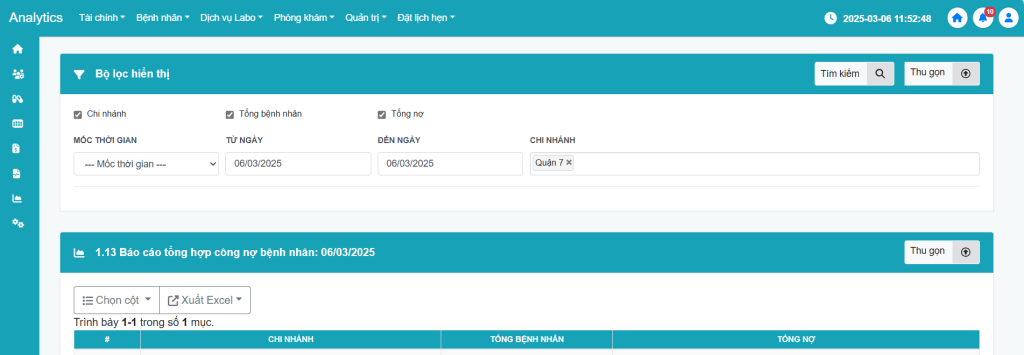 - Nhấn chọn Chi nhánh và Tổng nợ bỏ chọn Tổng bệnh nhân