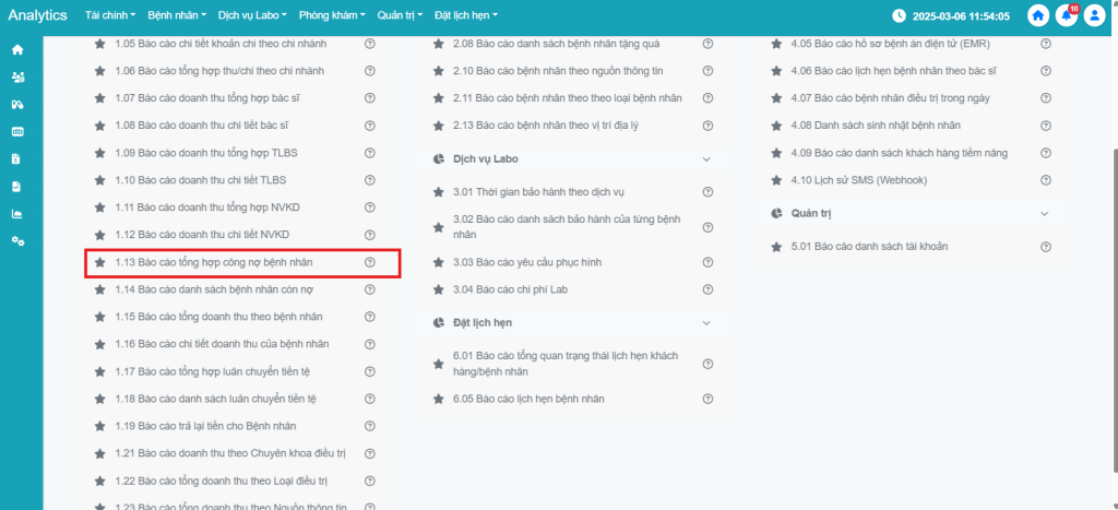 Bước 3: Tìm đến mục 1.13 Báo cáo tổng hợp công nợ bệnh nhân