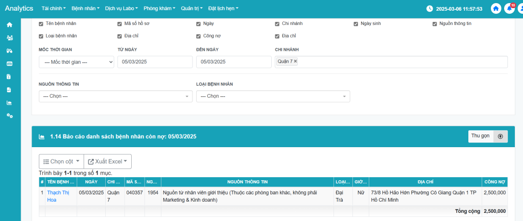 Bước 6: Bạn có thể nhấn vào chi nhánh để đi đến trang 1.14 Báo cáo danh sách bệnh nhân còn nợ