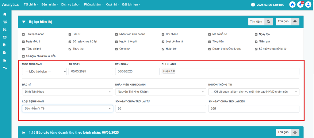 - Nhấn chọn Tên bệnh nhân, Bác sĩ, Nhân viên kinh doanh, Chi nhánh, Ngày tạo, Tổng tiền, Thực thu, Công nợ, Hoàn tiền bỏ chọn Mã số hồ sơ, Ngày điều trị, Số ngày chưa trở lại, Nguồn thông tin, Loại bệnh nhân, Giảm giá, Tổng chi phí, Doanh thu hưởng lương, Số ngày chưa trờ lại từ, Số ngày chưa trở lại đến
