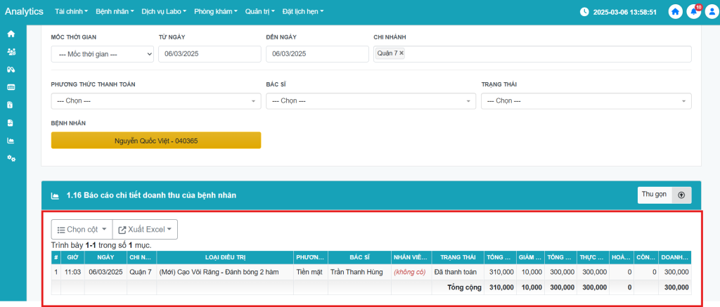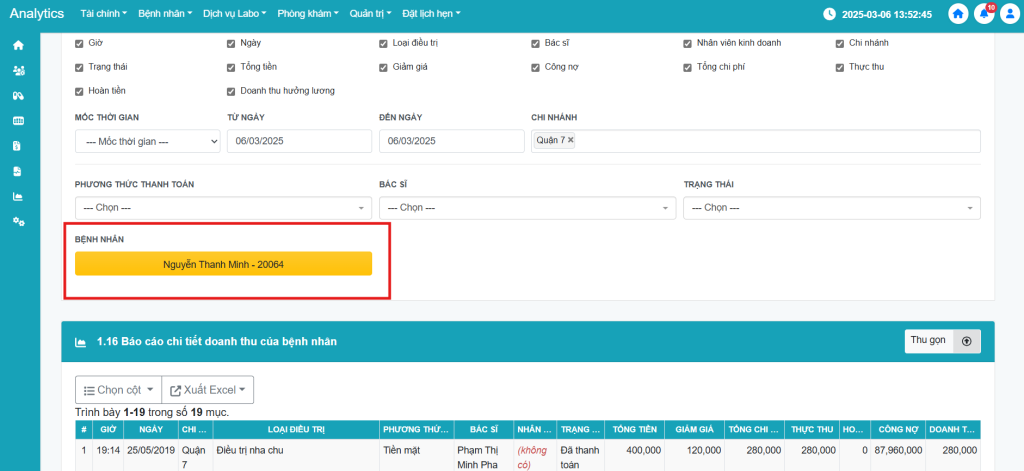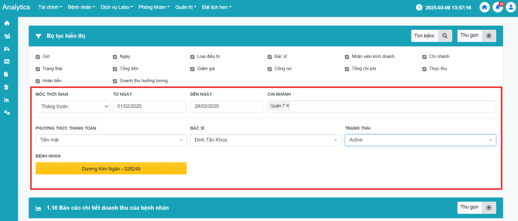 [Báo cáo] Hướng dẫn sử dụng tính năng Báo cáo chi tiết doanh thu của bệnh nhân