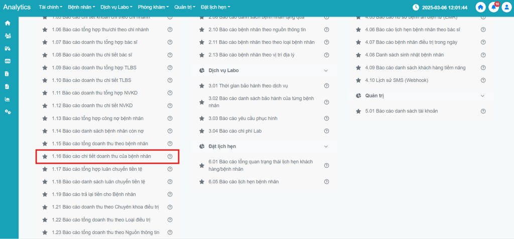 Bước 3: Tìm đến mục 1.16 Báo cáo chi tiết doanh thu của bệnh nhân