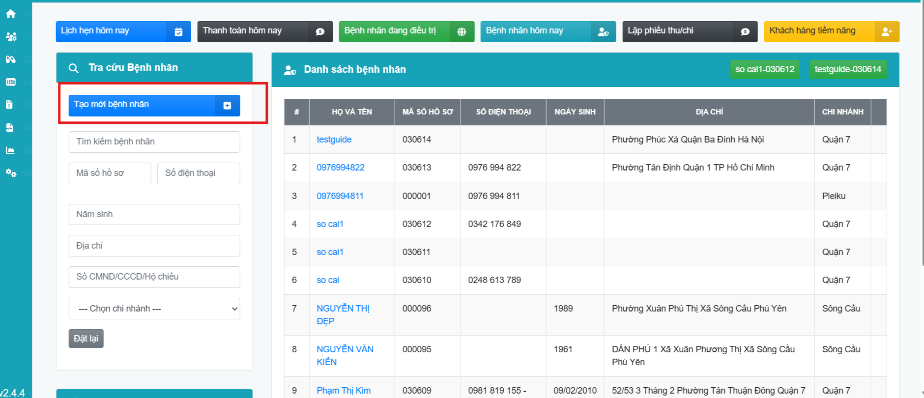 Bước 3.2.1: Bấm tạo mới bệnh nhân trên trang chủ phần mềm quản lý phòng khám