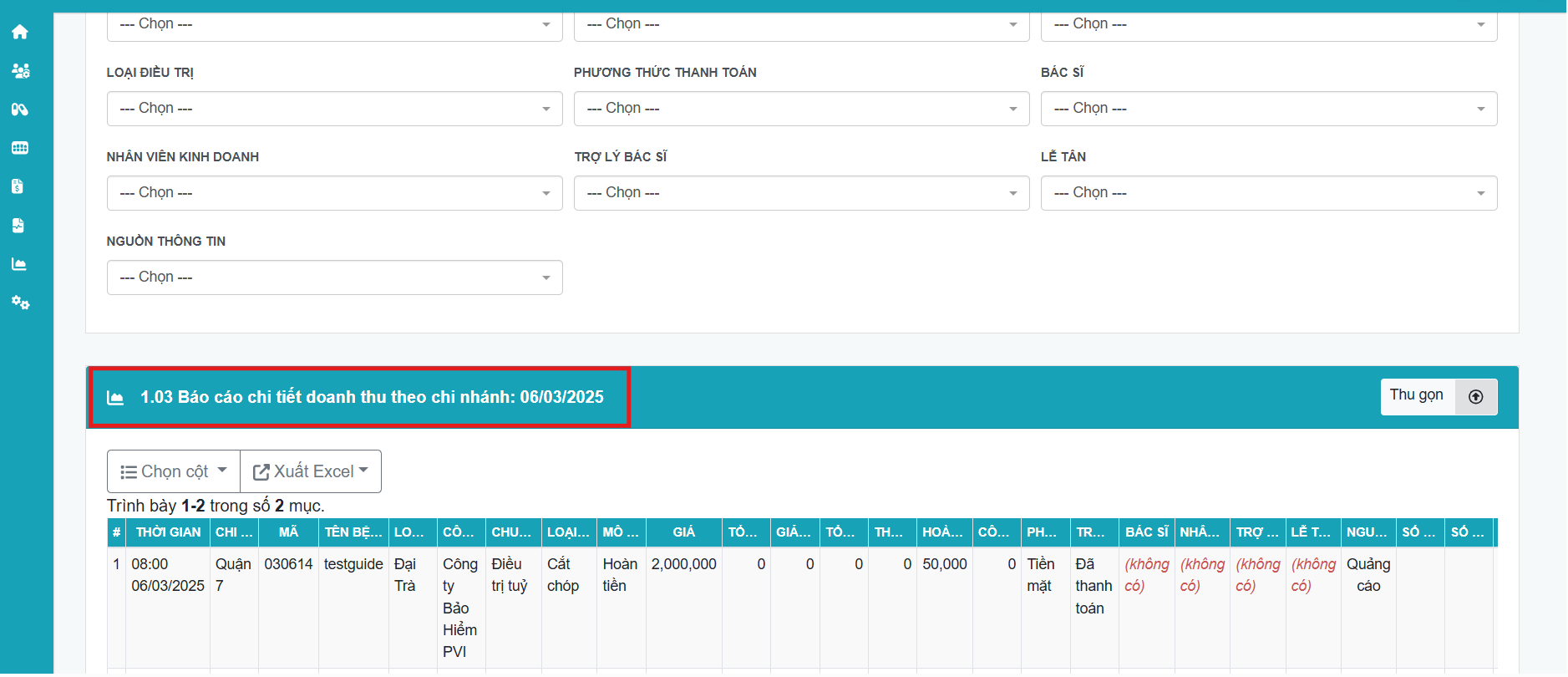- Báo cáo chi tiết doanh thu theo chi nhánh