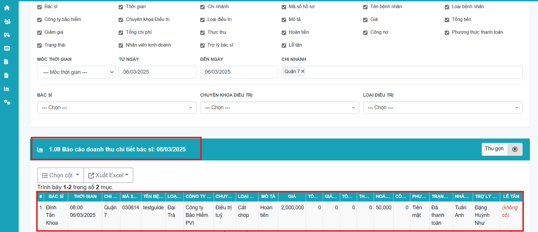 - Báo cáo chi tiết doanh thu theo bác sĩ
