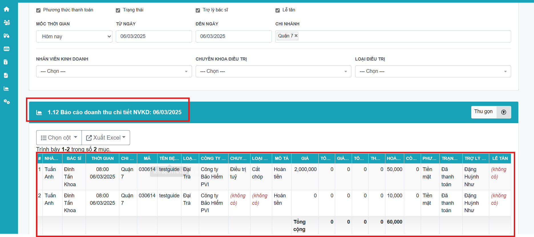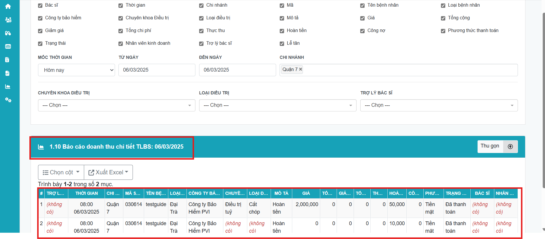 - Báo cáo chi tiết doanh thu theo trợ lý bác sĩ