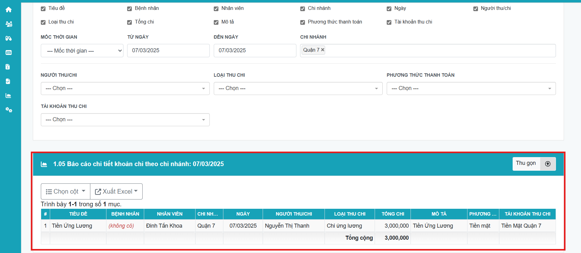 Bước 7: Kiểm tra báo cáo chi ứng lương trong 1.05 Báo cáo chi tiết khoản chi theo chi nhánh
