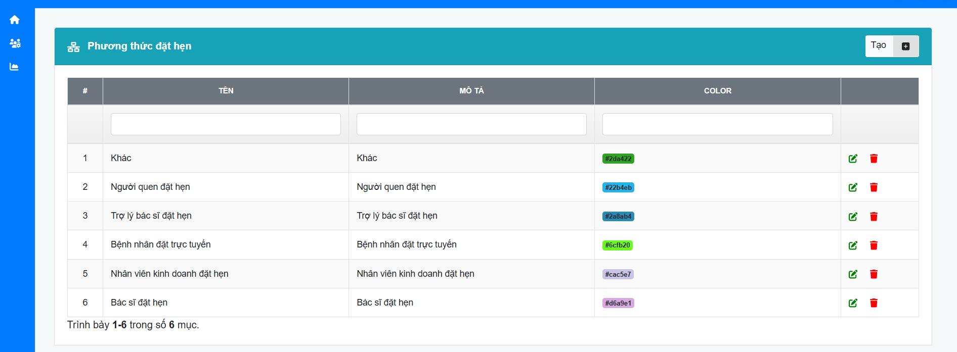 Mô tả: Phương thức đặt hẹn giúp cho người dùng có thể biết được phương thức mà bệnh nhân đặt hẹn như: Bác sĩ đặt hẹn cho bệnh nhân, Nhân viên kinh doanh đặt cho bệnh nhân, Bênh nhân tự đặt trực tuyến, Trợ lý bác sĩ đặt cho bệnh nhân, Người quen của bệnh nhân đặt …