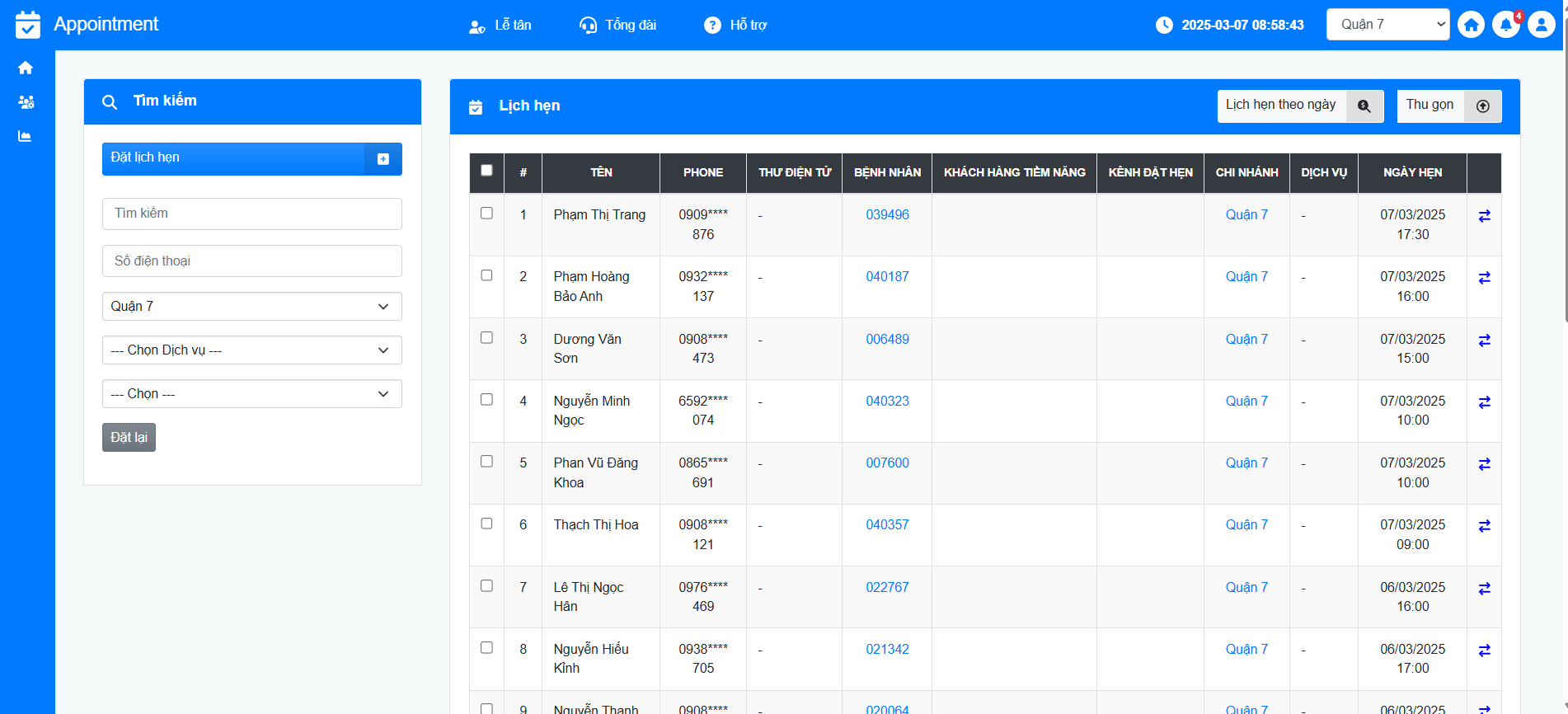 | 1 | Lịch hẹn | Chức năng lịch hẹn giúp người dùng (Quản lý, lễ tân, bác sĩ, trợ lý bác sĩ, nhân viên kinh doanh) tạo lịch hẹn, quản lý lịch hẹn của bệnh nhân/khách hàng |