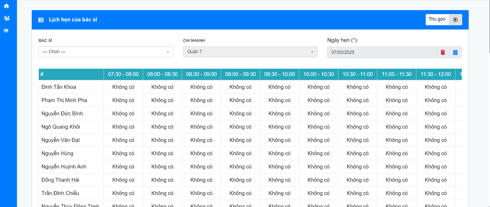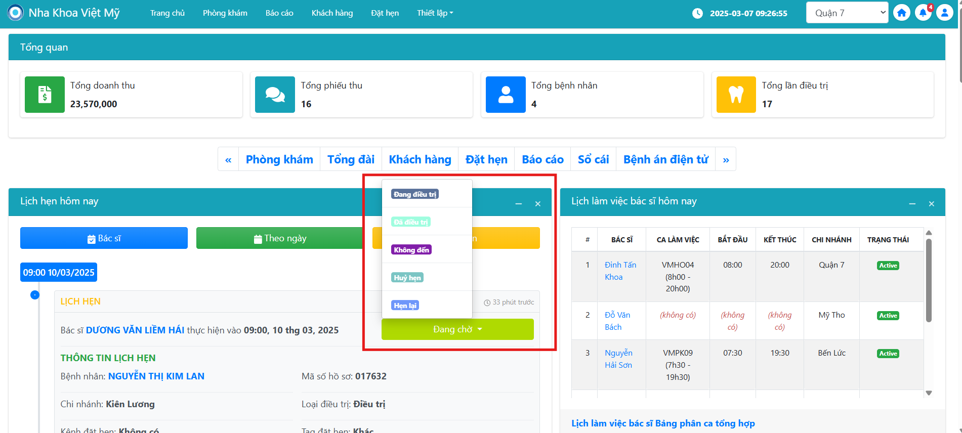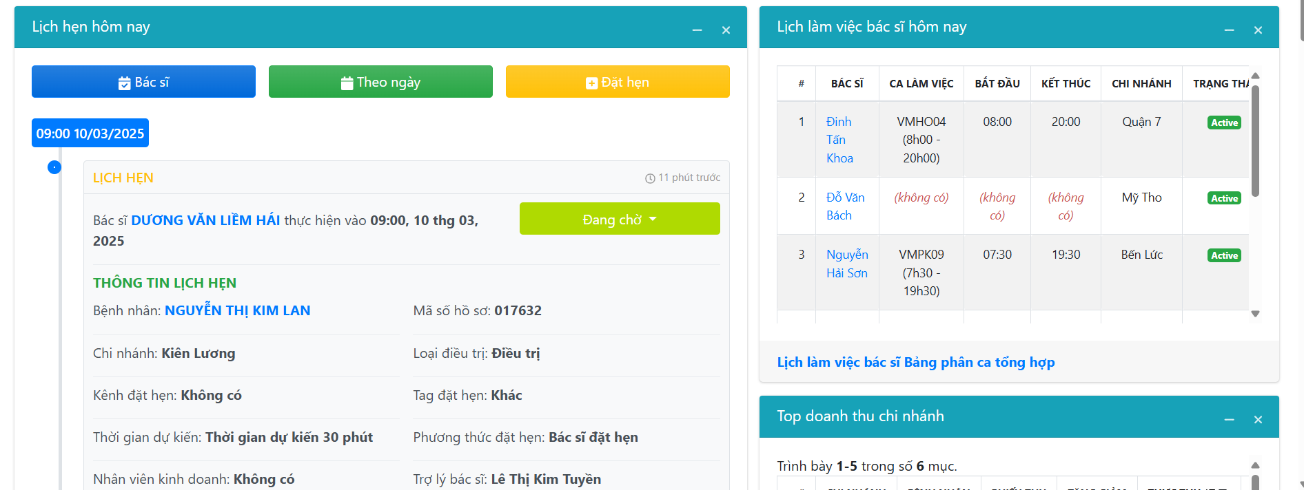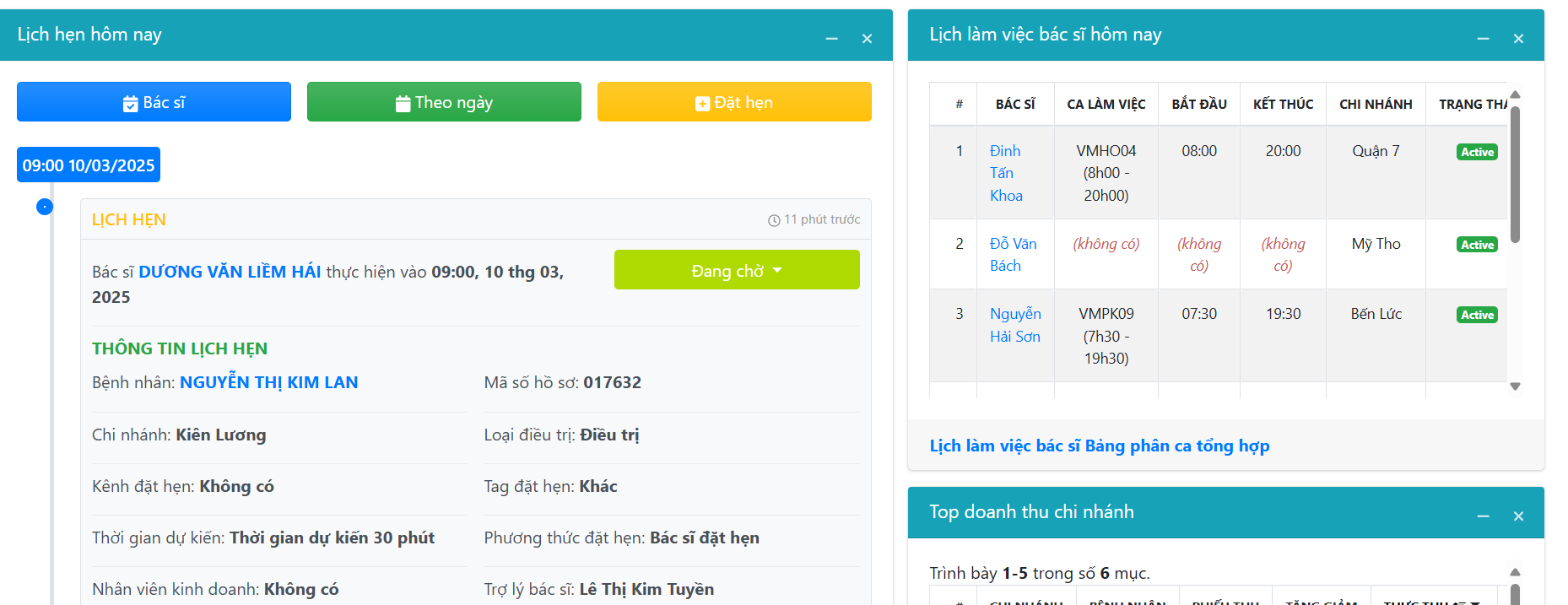 Hệ thống đặt lịch hẹn – phân ca – điều phối giúp cho người dùng (Lễ tân, bác sĩ, trợ lý bác sĩ, nhân viên kinh doanh, quản lý phòng khám …) có thể đặt lịch hẹn, quản lý lịch hẹn và theo dõi lịch hẹn của khách hàng/bệnh nhân. Giúp điều phối thời gian hẹn của bác sĩ, giúp tối ưu thời gian làm việc, tránh trường hợp chồng chéo lịch hẹn gây khó khăn cho việc điều trị của bệnh nhân.